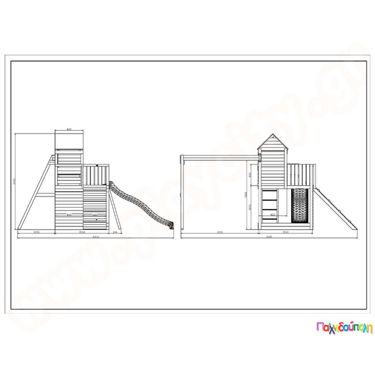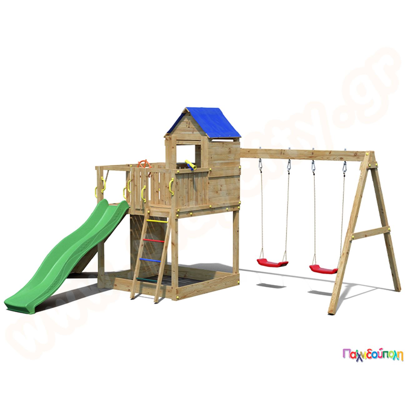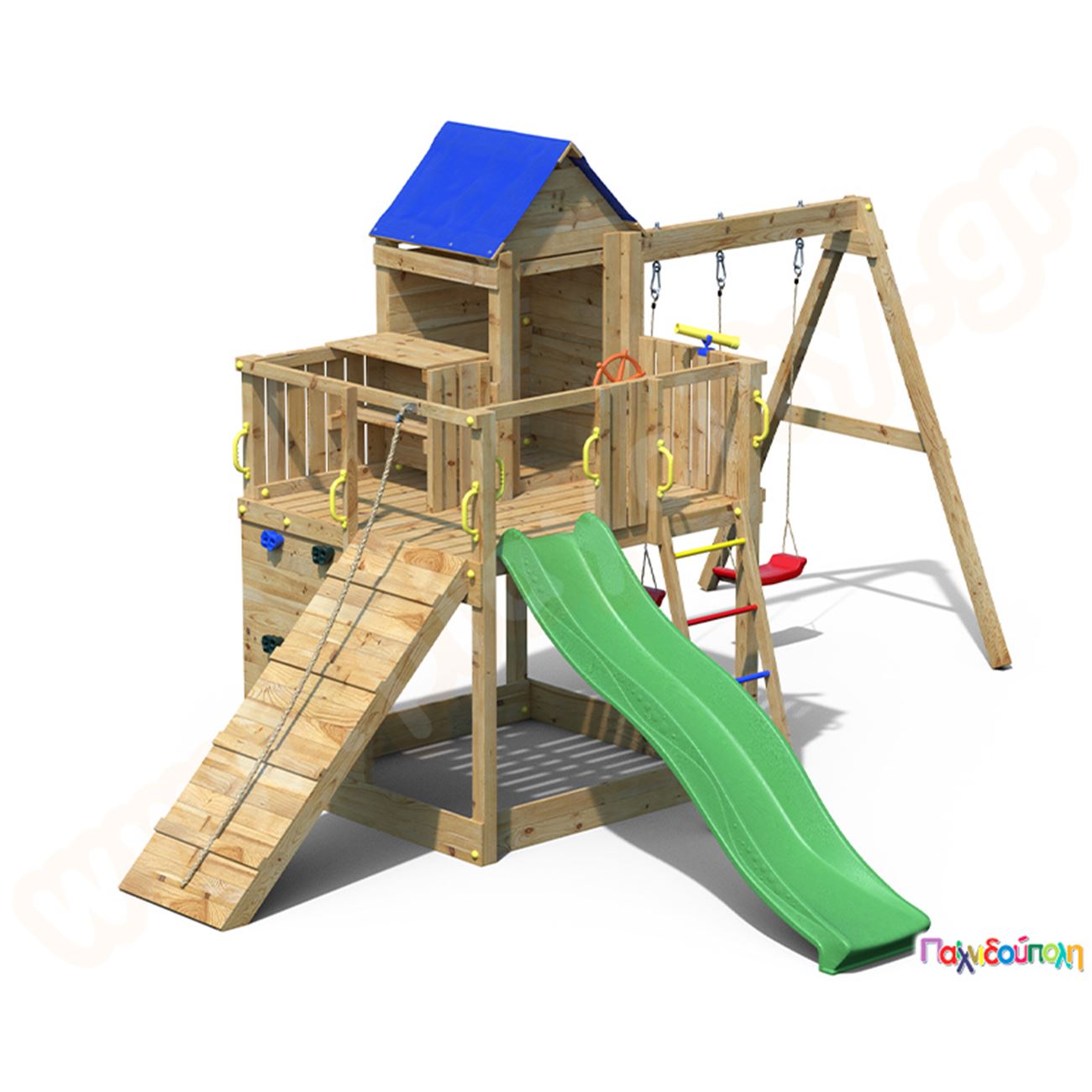 Ξύλινο δεντρόσπιτο αναρρίχησης με τσουλήθρα και κούνιες
