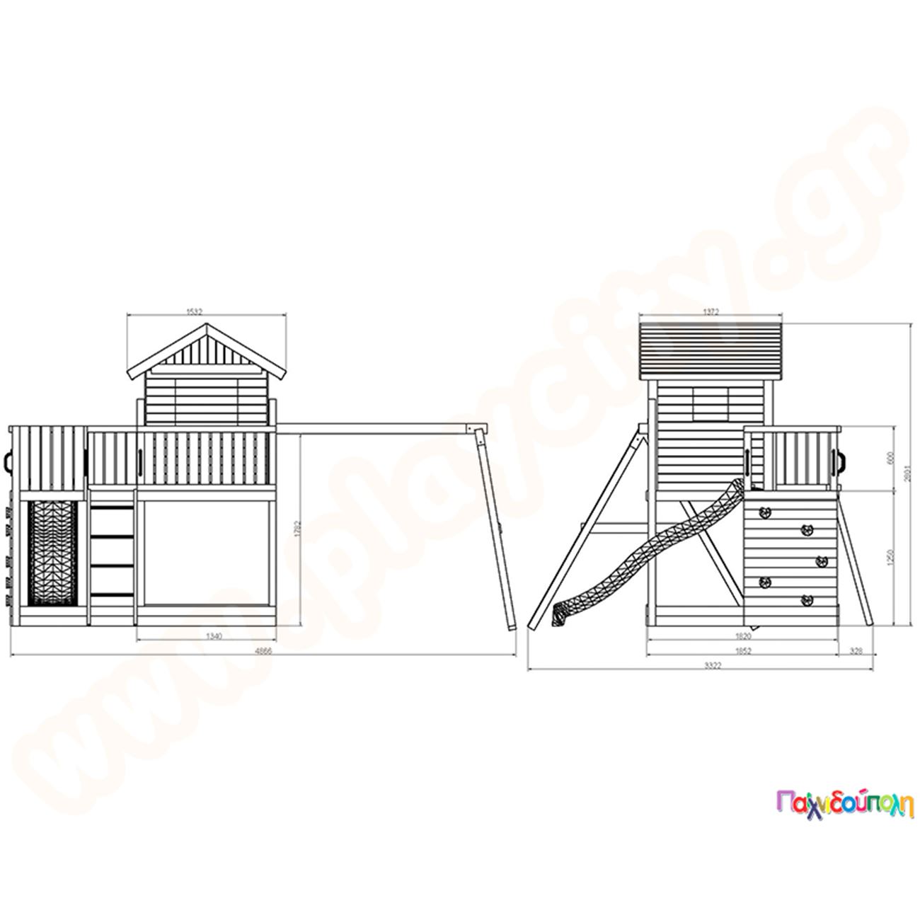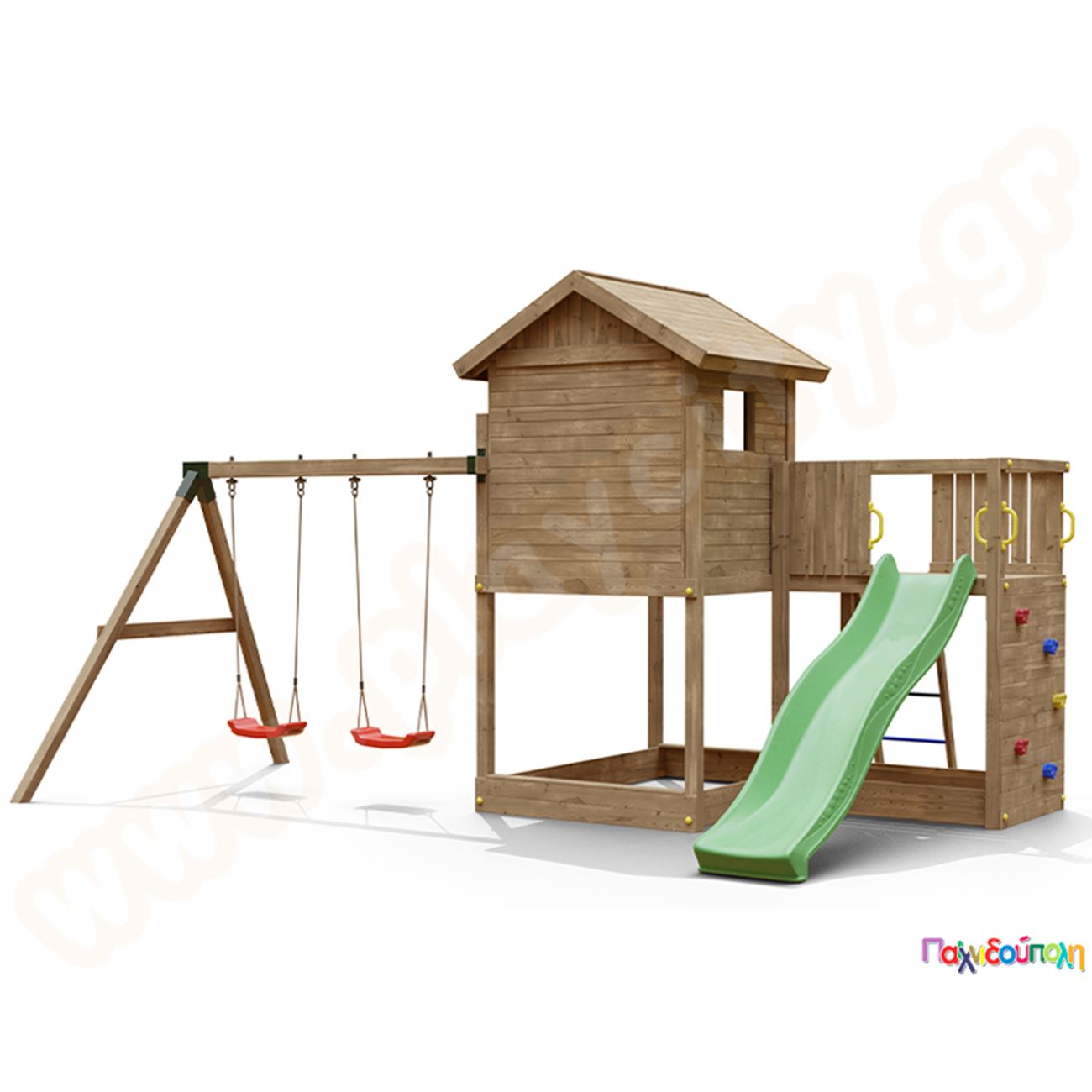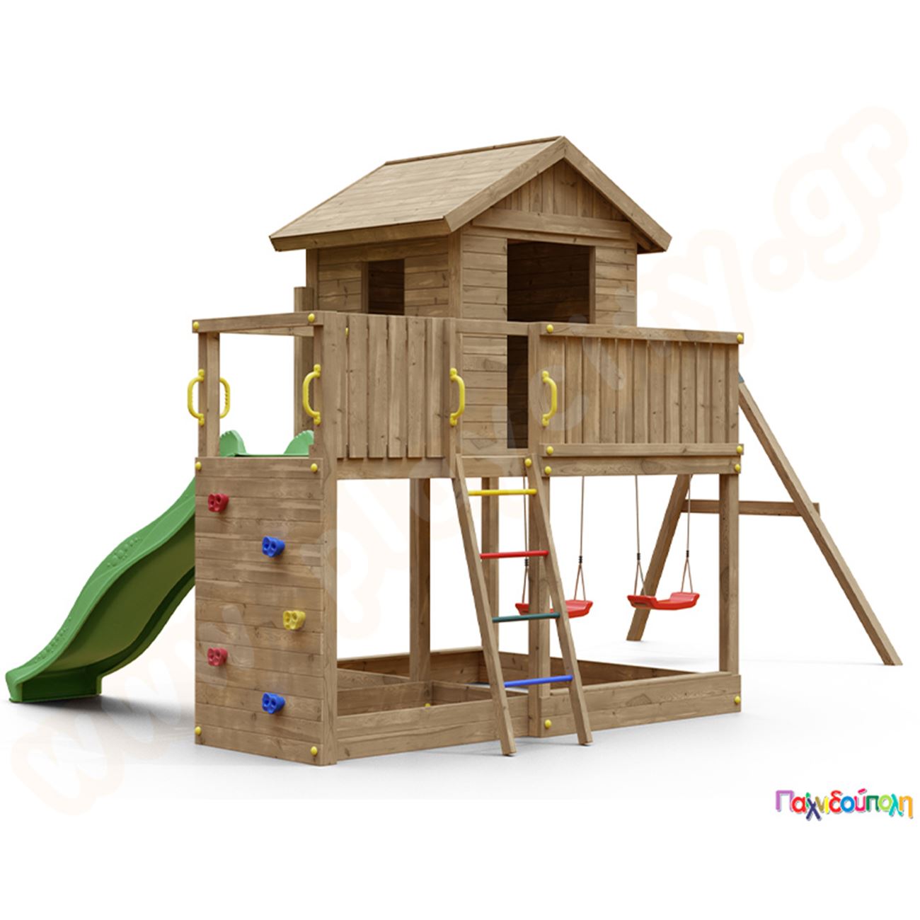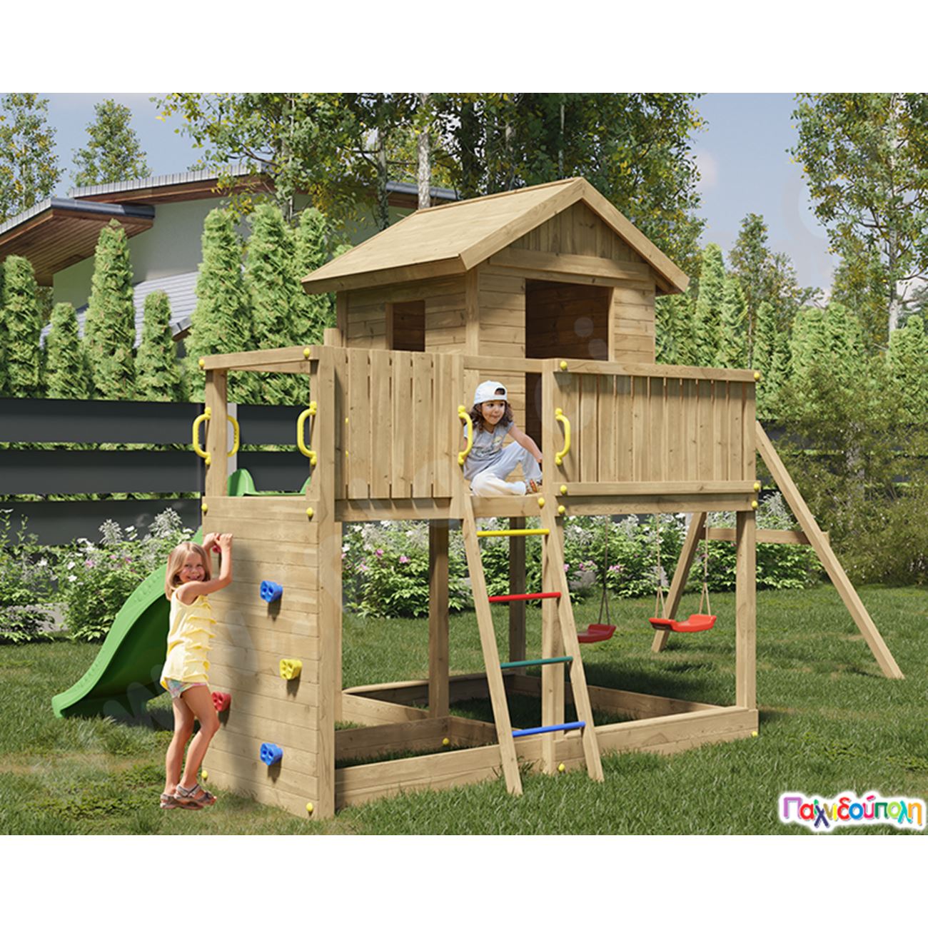 Ξύλινο δεντρόσπιτο με τσουλήθρα και κούνιες