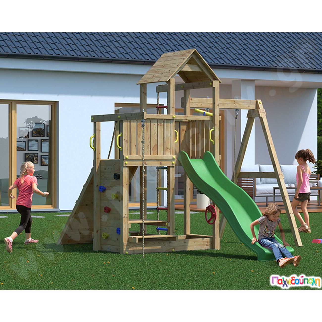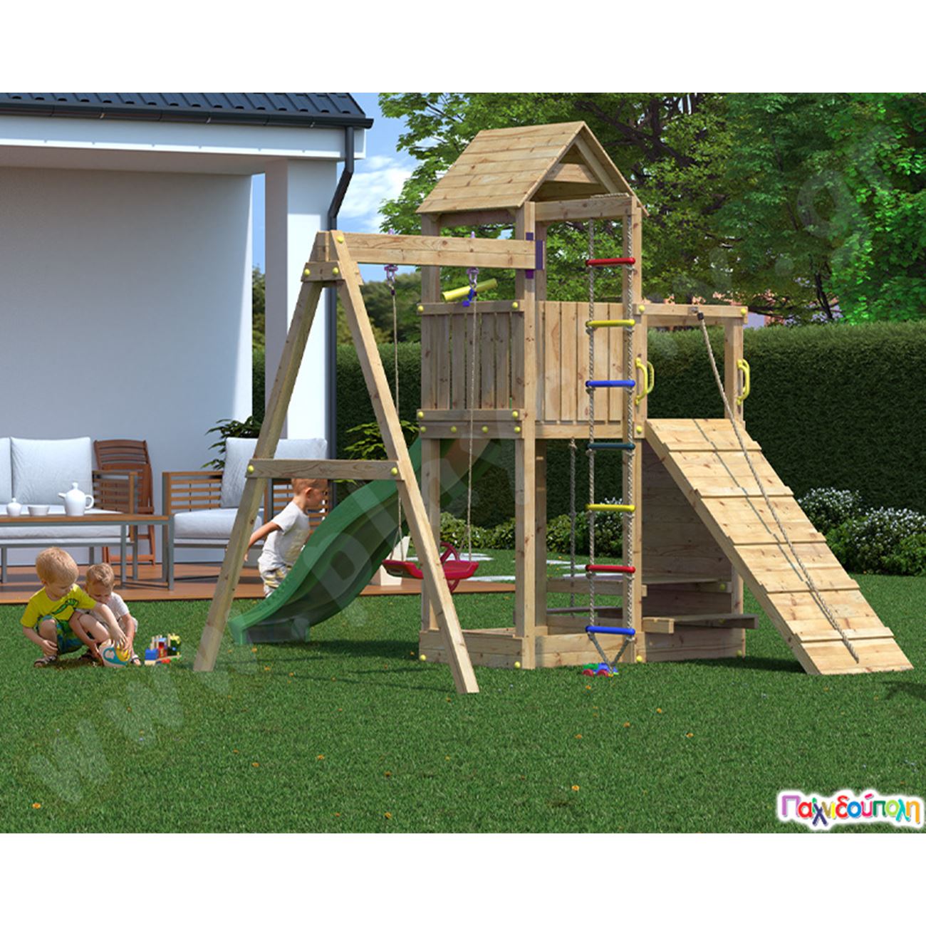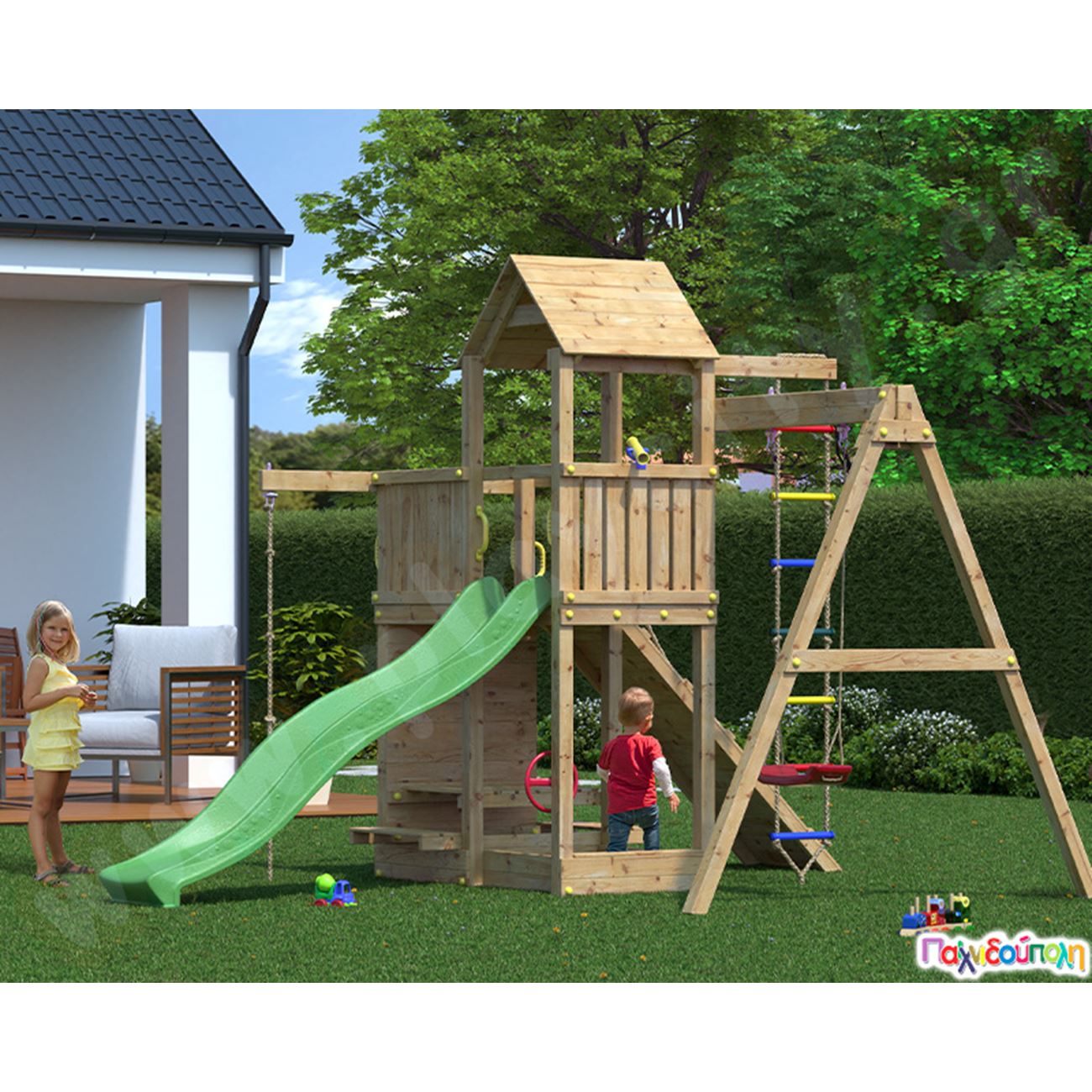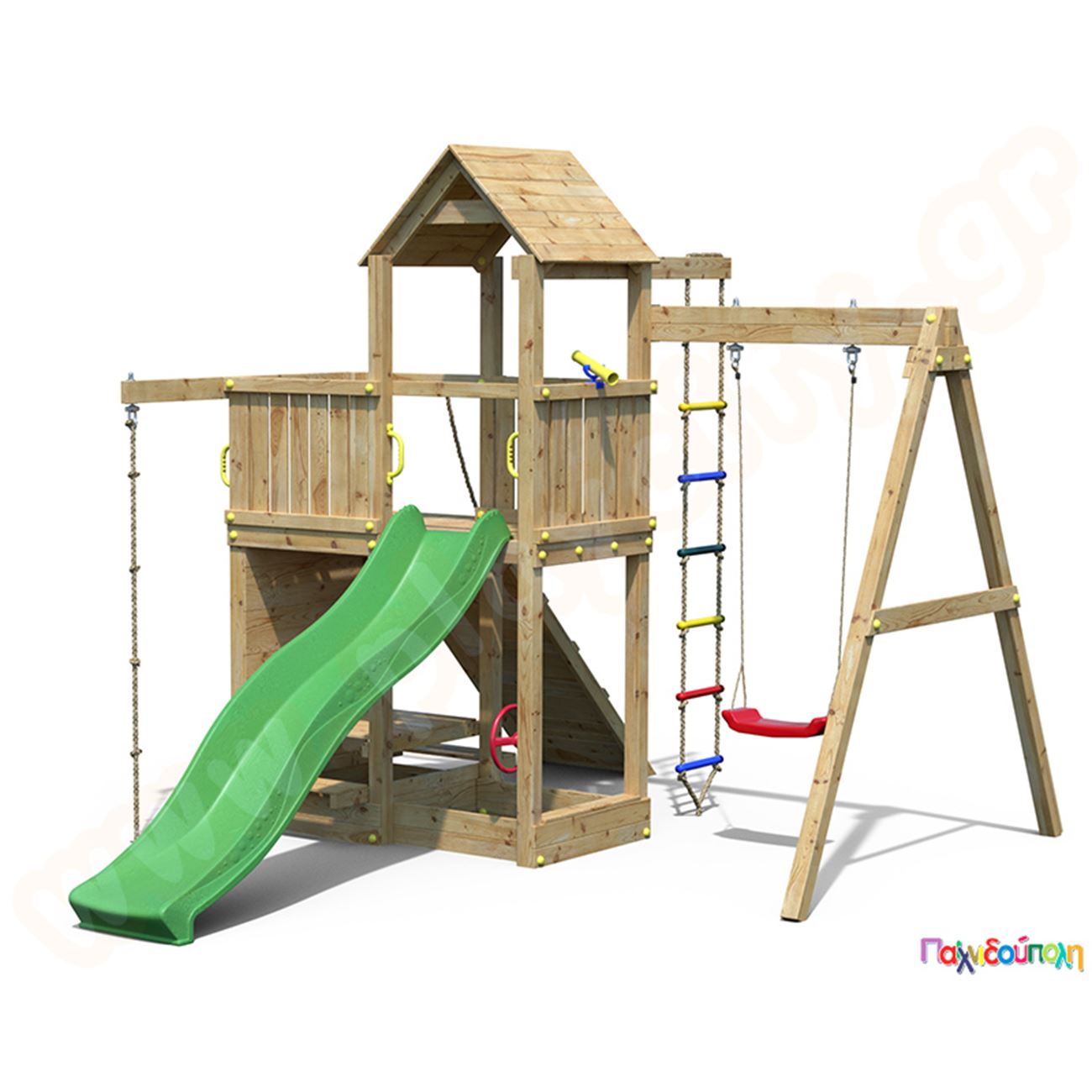 Ξύλινος πύργος με 3 αναρριχήσεις, τσουλήθρα και κούνια