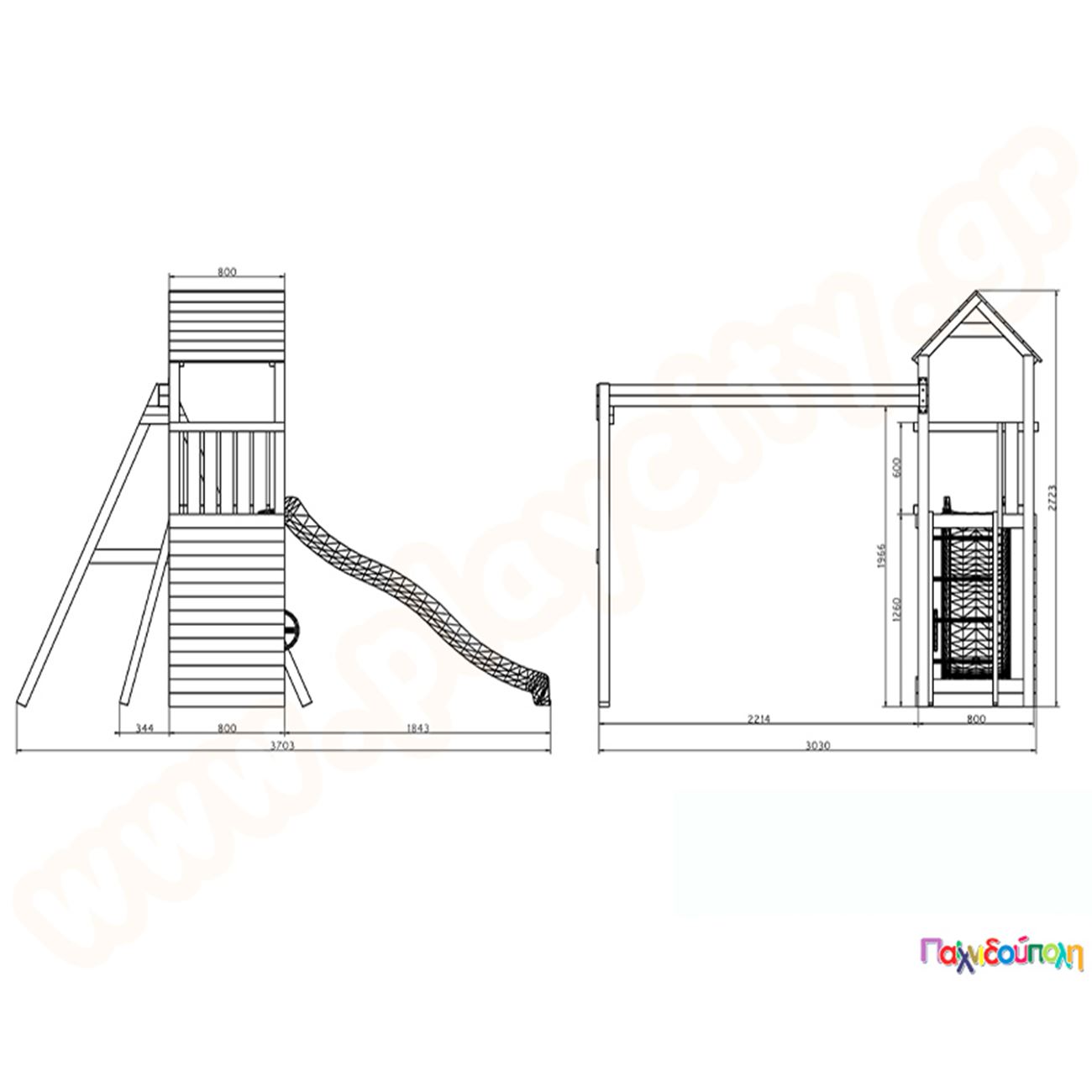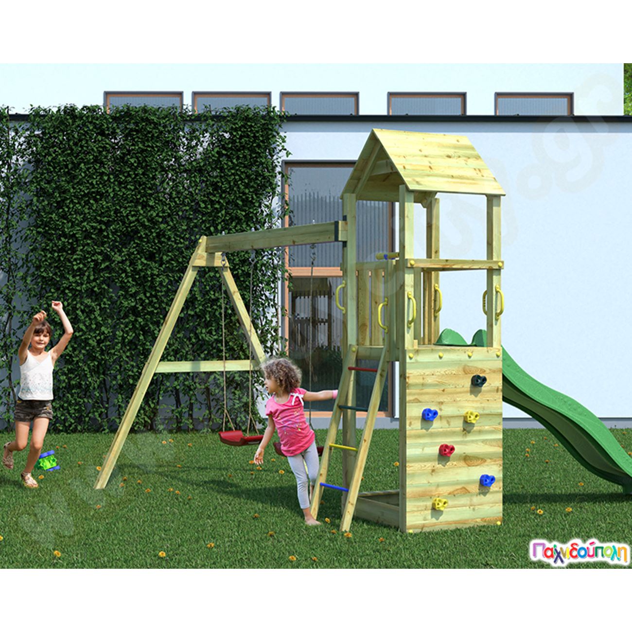 Ξύλινος πύργος με τσουλήθρα και 2 κούνιες
